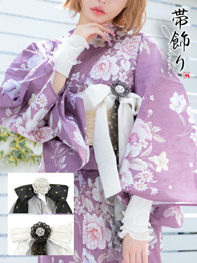 和装も映えコーデに導く♪ 浴衣小物 ガーリー ビジュー リボン ブローチ 帯飾り (ホワイト/ブラック)