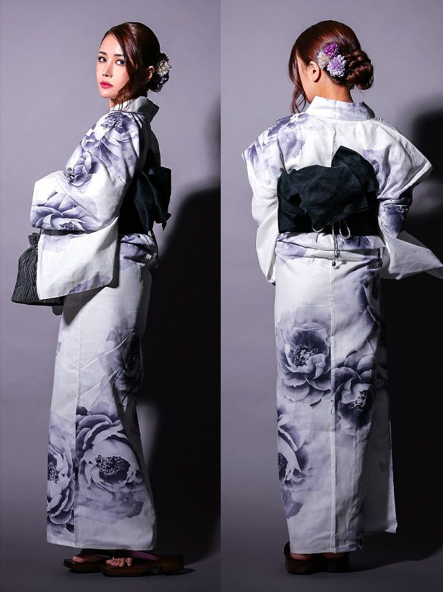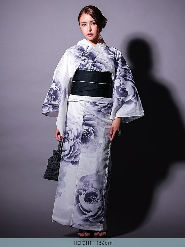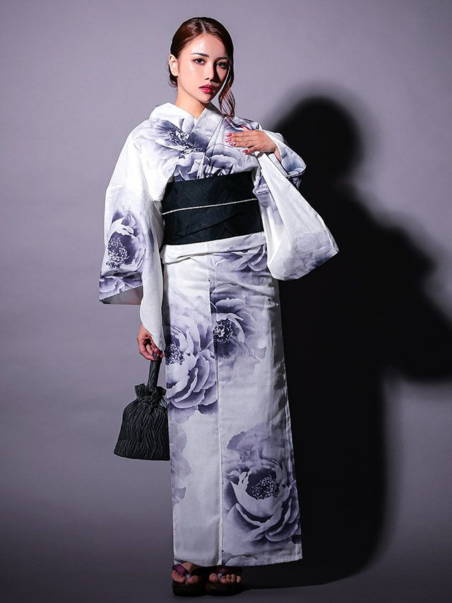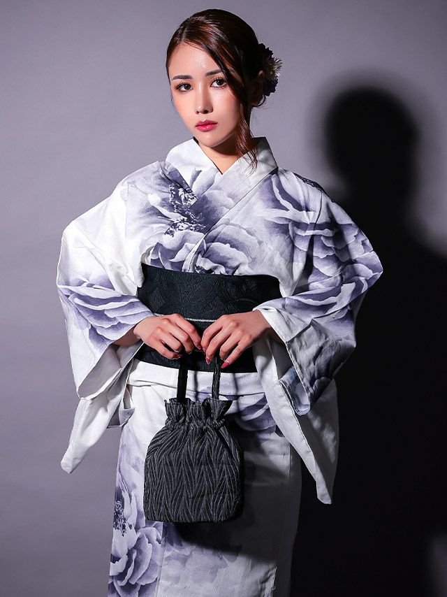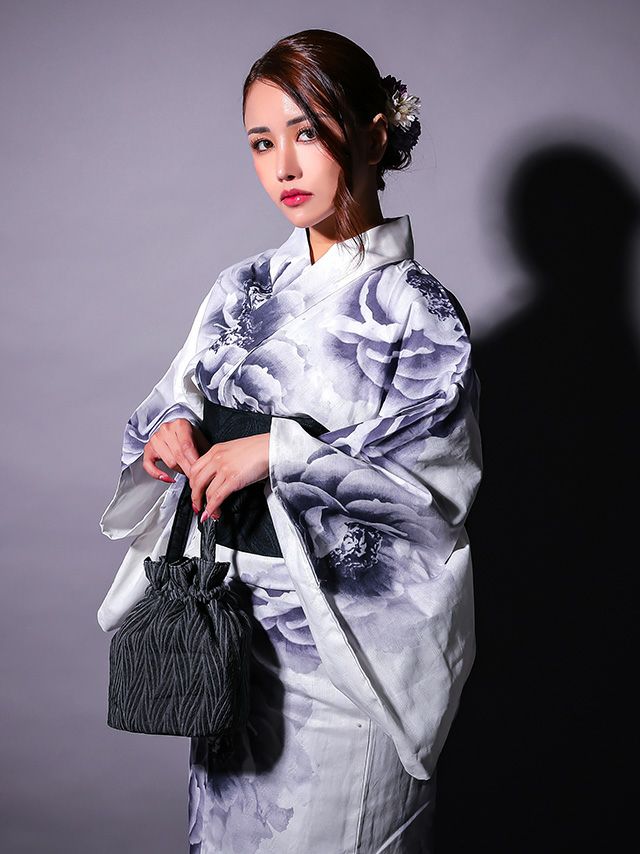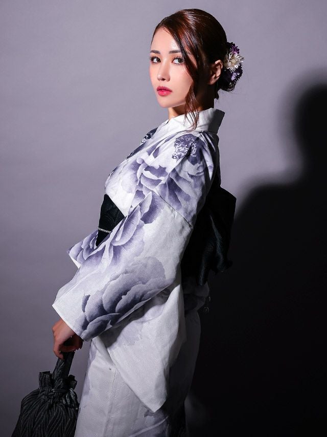 清涼感ある白地に大柄の牡丹をグラデーションで彩った、大人のための浴衣3点セット☆