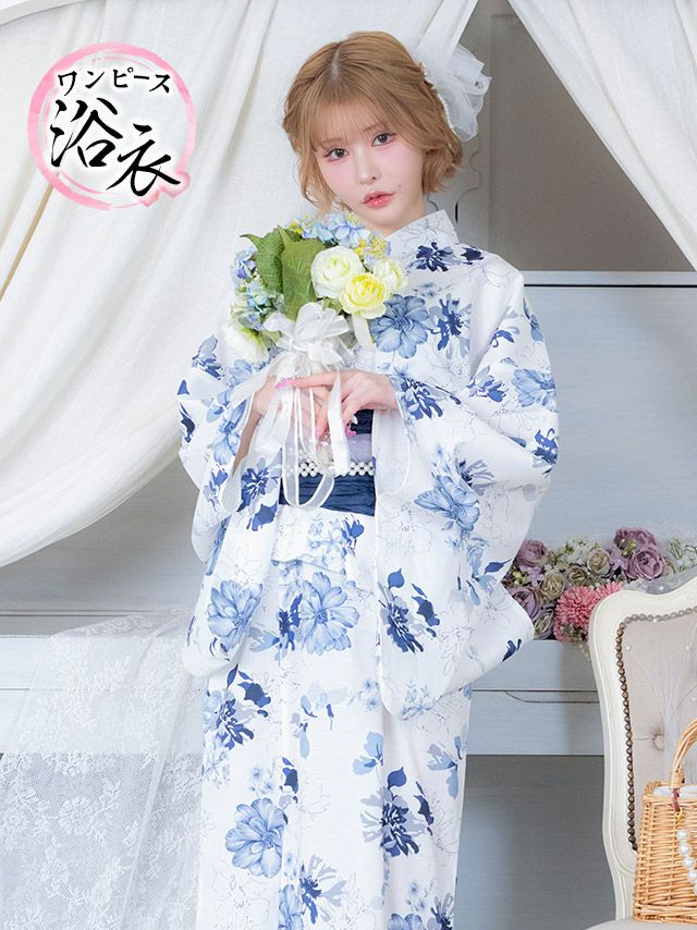 5. 浴衣 ワンピース 白地 水彩 ニュアンスフラワー ゆかた3点セット (浴衣羽織+ワンピース+兵児帯)