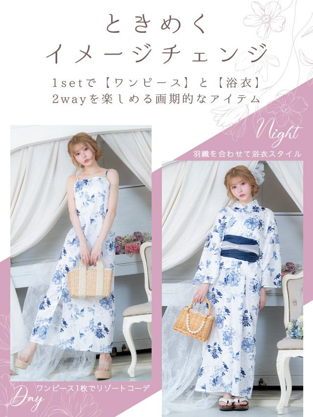 浴衣とワンピースの2Wayを楽しめる♪ 浴衣 ワンピース 白地 水彩 ニュアンスフラワー ゆかた3点セット (浴衣羽織+ワンピース+兵児帯)