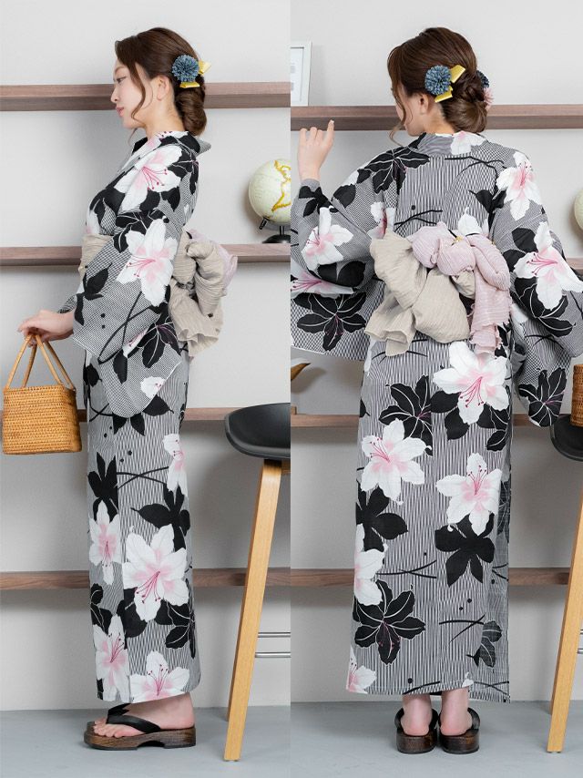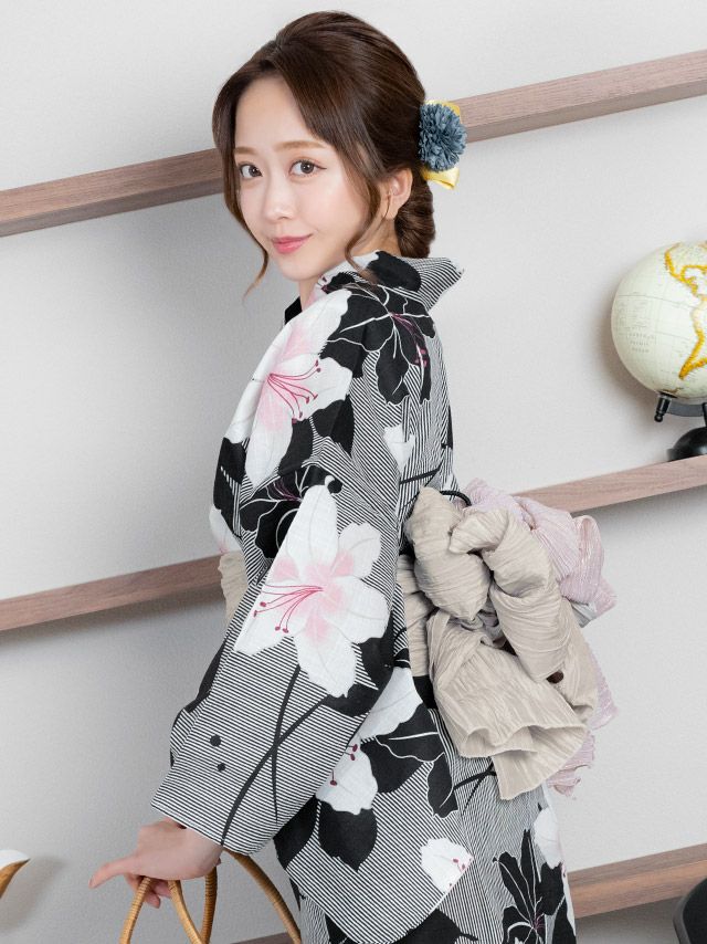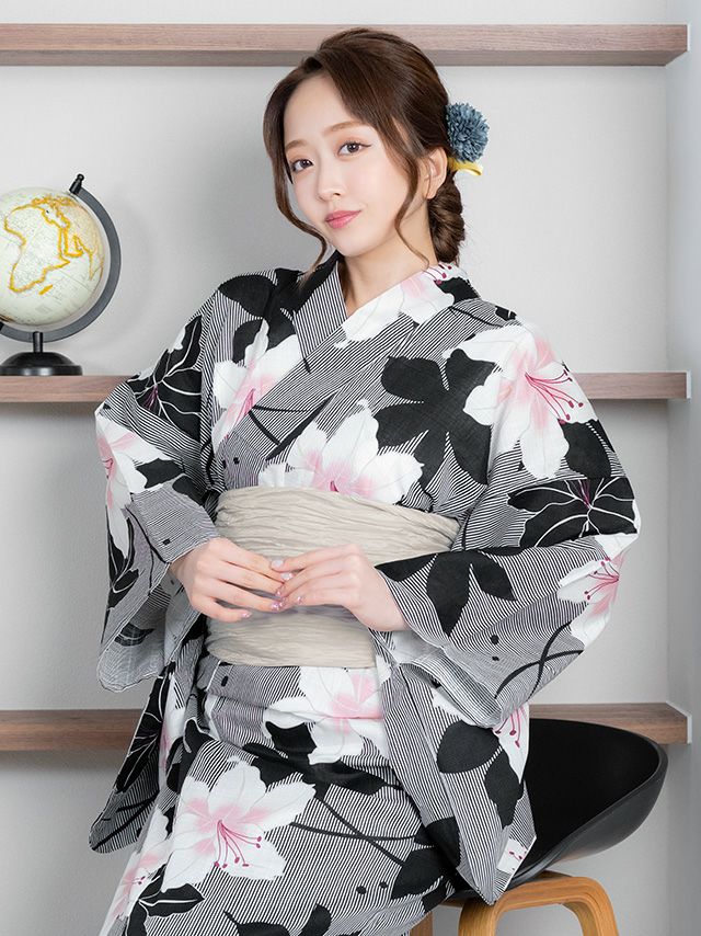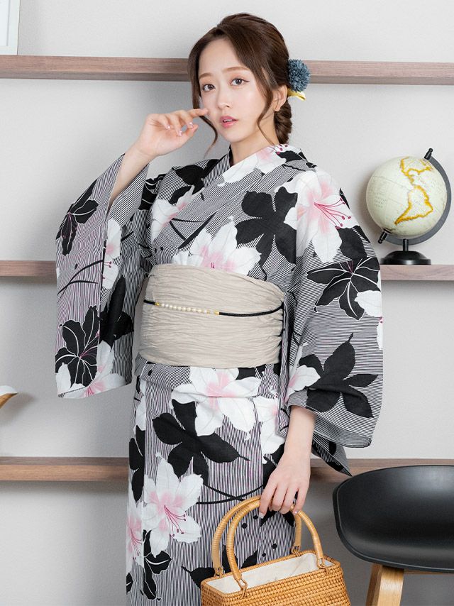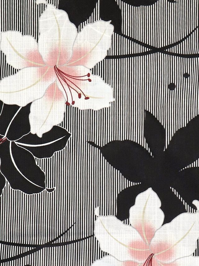 着痩せ効果抜群のスタイリッシュな縞模様に、大輪の百合が華やかに咲き誇るモダン浴衣。