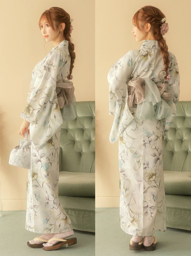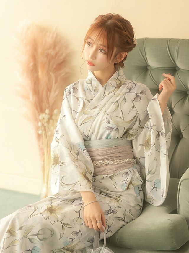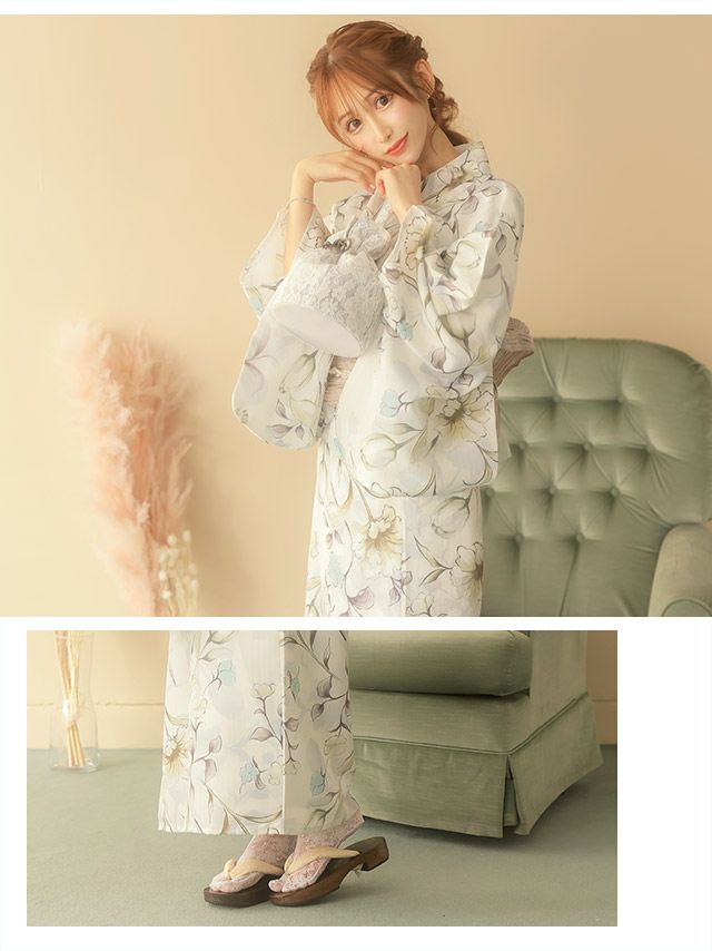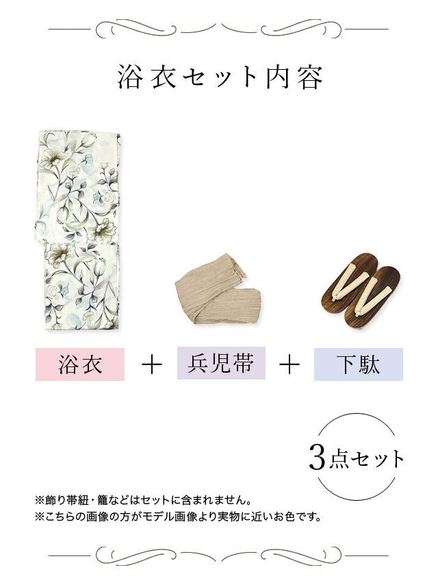 4. 浴衣 SWEET ホワイト×水彩フラワー ゆかた3点セット (浴衣+兵児帯+下駄)