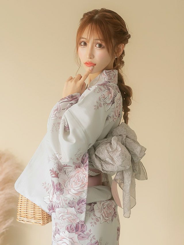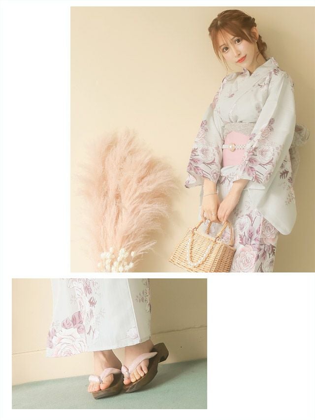 4. 浴衣 選べる帯 SWEET くすみグレー×クラシカルローズゆかた3点セット (浴衣+平帯or作り帯+下駄) (浦西ひかる着用)