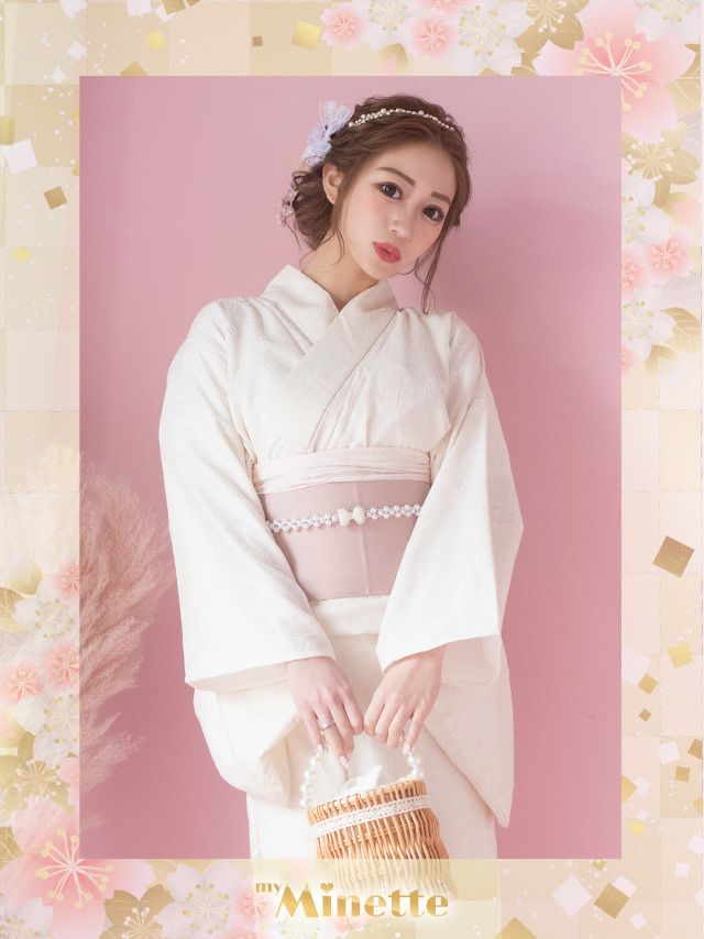 4. 浴衣 SWEET シフォン×アイボリー×フラワーレース 高級ゆかた3点セット (浴衣+平帯or作り帯+下駄) (なぎ着用)