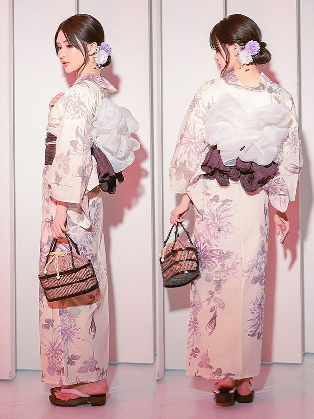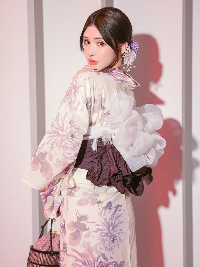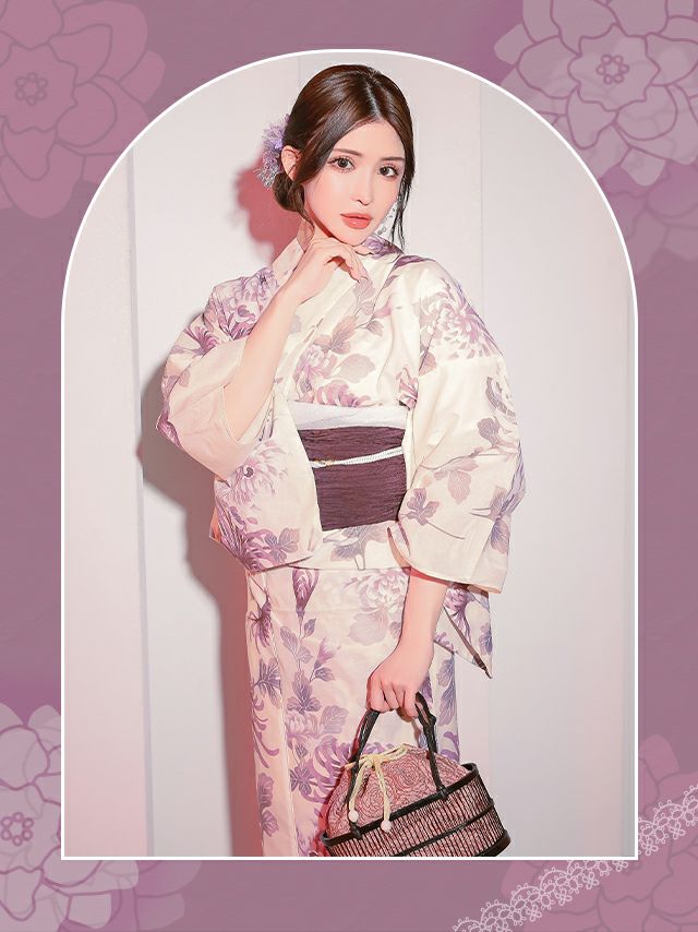 4. 浴衣 妖艶 生成り地×ピンクパープル乱菊 ゆかた3点セット (浴衣+兵児帯+下駄)