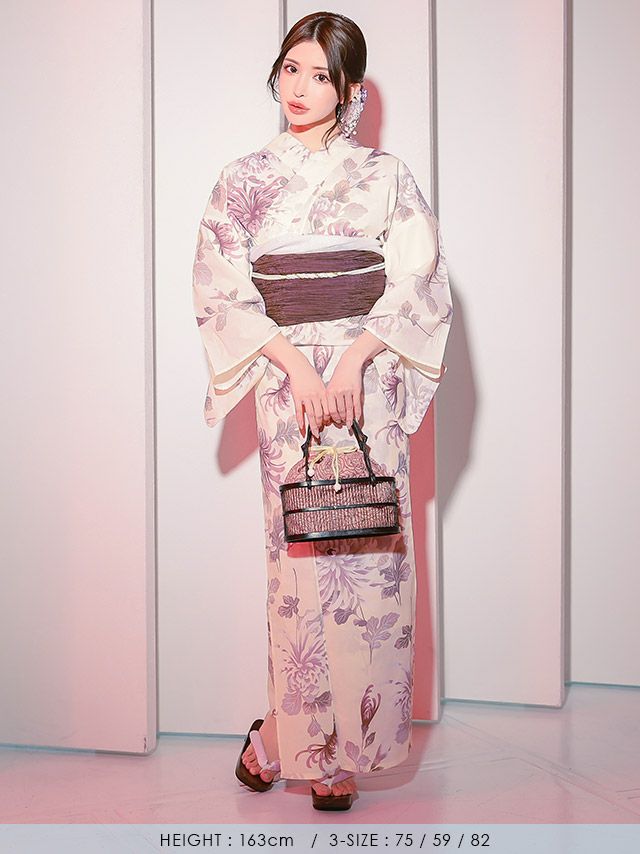 浴衣 妖艶 生成り地×ピンクパープル乱菊 ゆかた3点セット (浴衣+兵児帯+下駄)