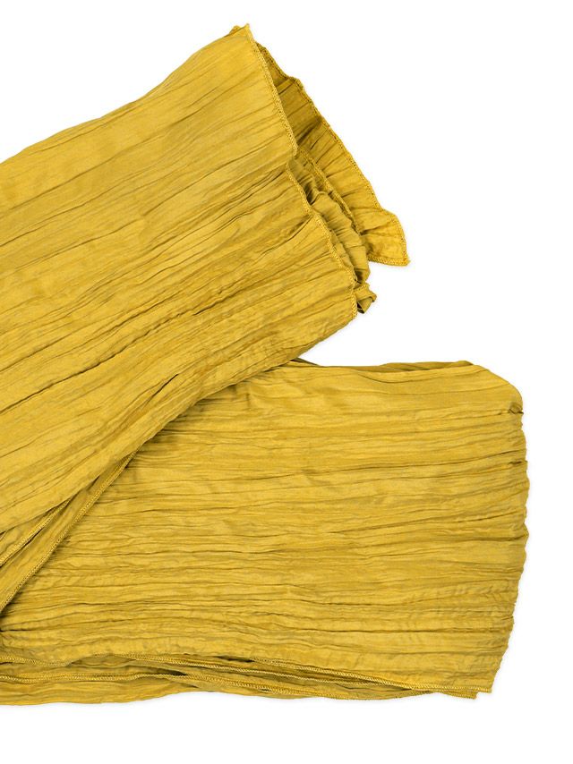 落ち着きのあるからし色の帯でコーデを明るく見せ、