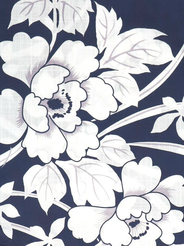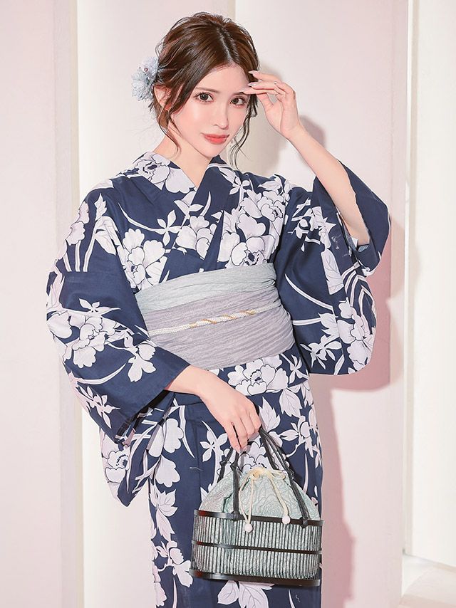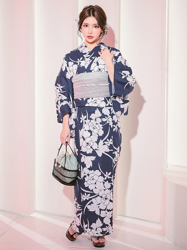 妖艶 紺地×大きな白牡丹 ゆかた2点セット