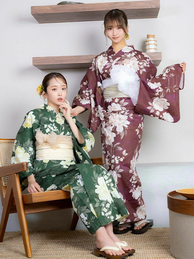 5. 浴衣 レトロ ワイン ニュアンス 牡丹 ゆかた 3点セット (浴衣+兵児帯+下駄)