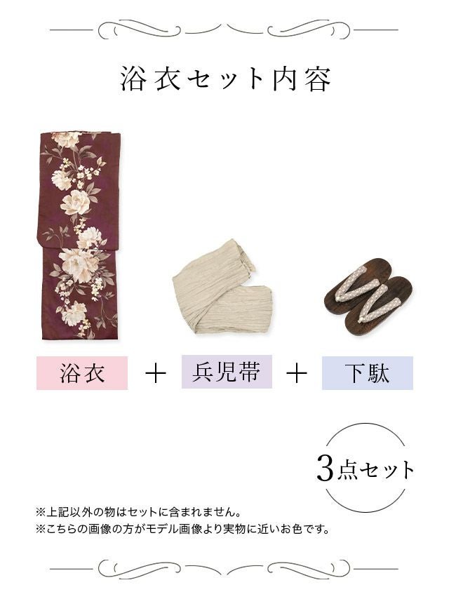 4. 浴衣 レトロ ワイン ニュアンス 牡丹 ゆかた 3点セット (浴衣+兵児帯+下駄)