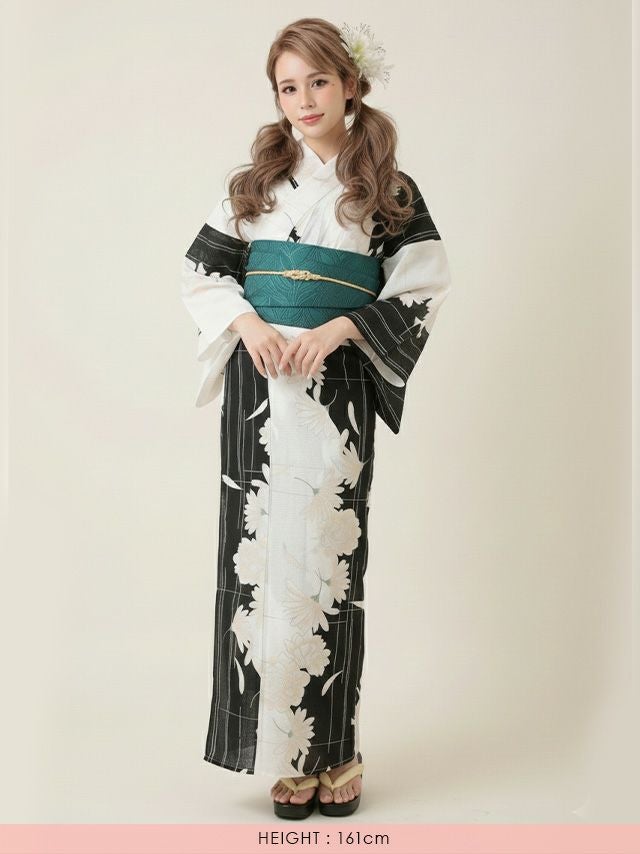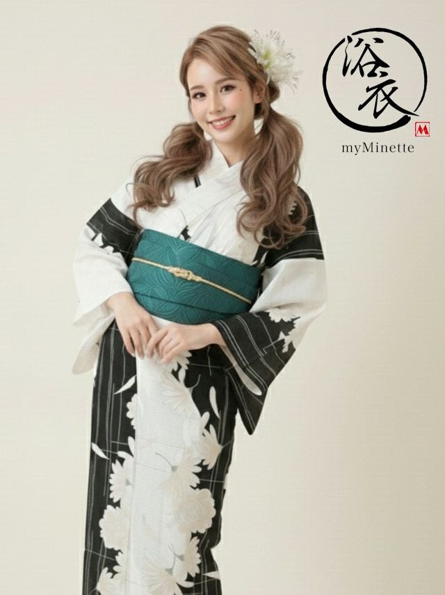 モノトーン配色に牡丹柄とグリーンの帯が映える、クールな大人デザイン。