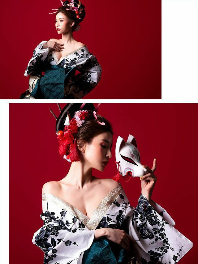 3. 花魁 白地に椿 2way おいらん浴衣5点セット (浴衣+下駄+平帯+兵児帯+肌襦袢) (石原彩香着用)