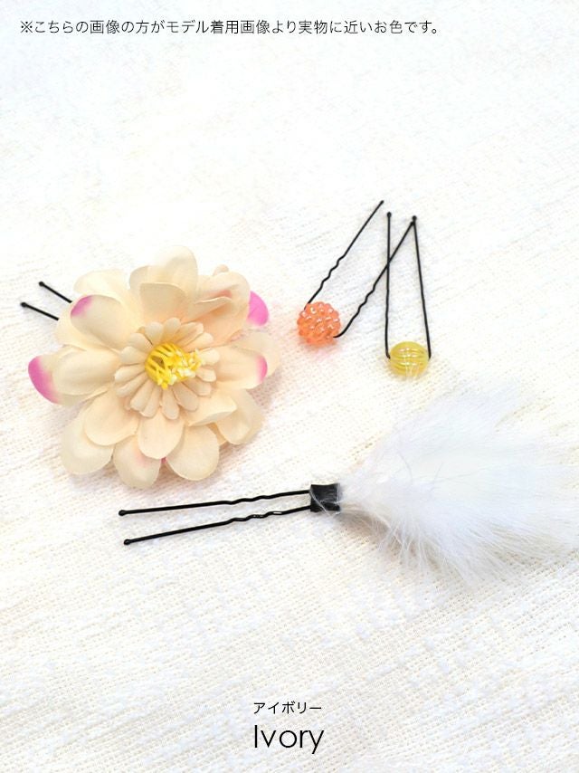 小物 ホワイトフェザー付きフラワー浴衣髪飾り4点セット