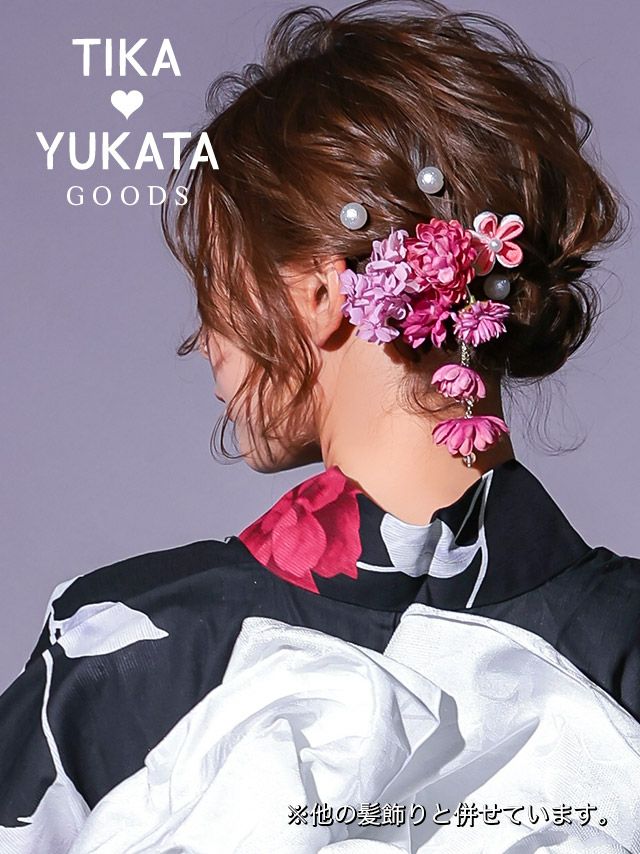 4. 髪飾り ニュアンスカラーフラワークリップ&しだれピン浴衣ヘアアクセサリー2点セット (ピンク/パープル)