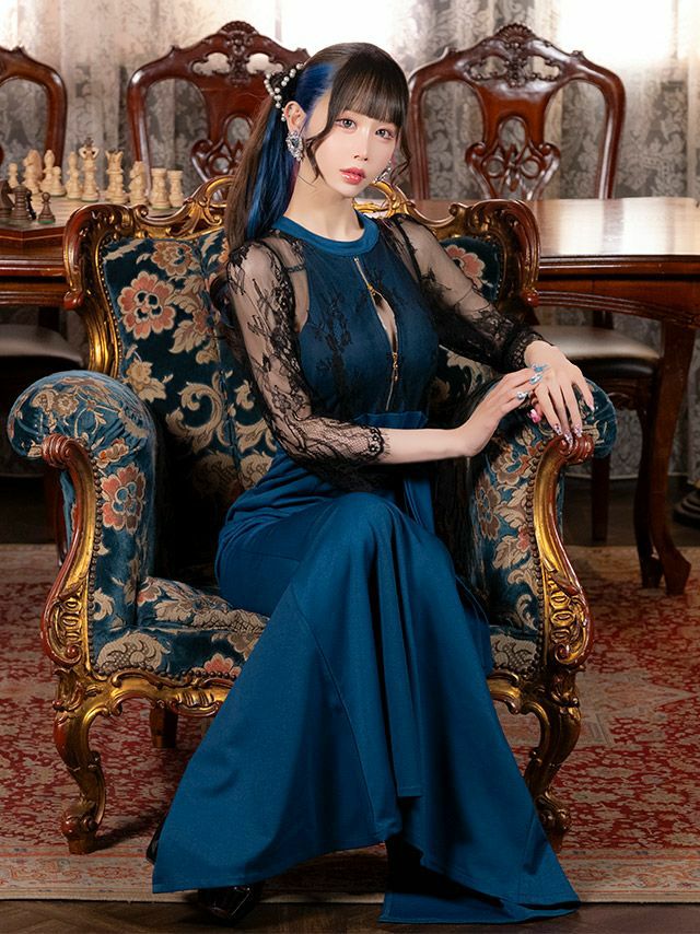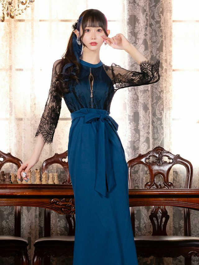 キャバドレス ロング丈 キャバクラ クラブ ラウンジ シアーブラックレース 袖あり 七分袖 バストジップ 谷間見せ ウエストリボン ストレッチ バックスリット タイトロングドレス