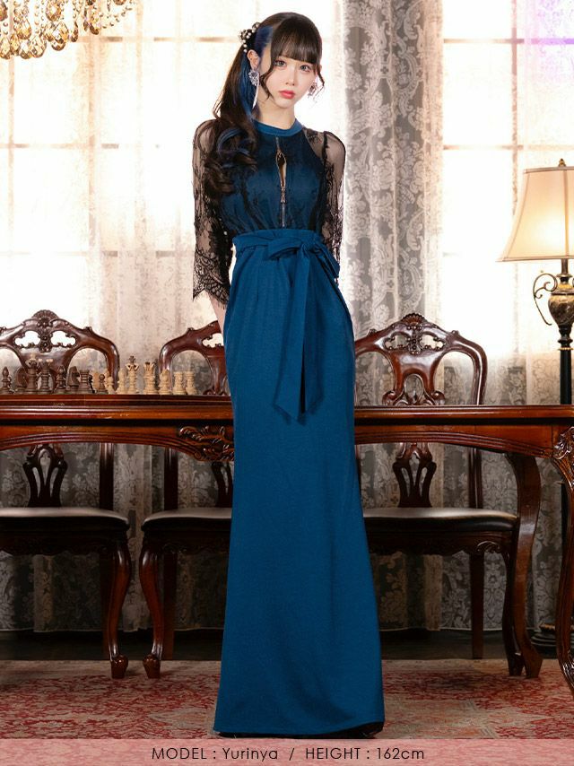 5. シアーブラックレース 袖あり 七分袖 バストジップ 谷間見せ ウエストリボン ストレッチ バックスリット タイトロングドレス (Sサイズ~XXLサイズ) (ゆりにゃ/キャバドレス着用) [Tika/ティカ]