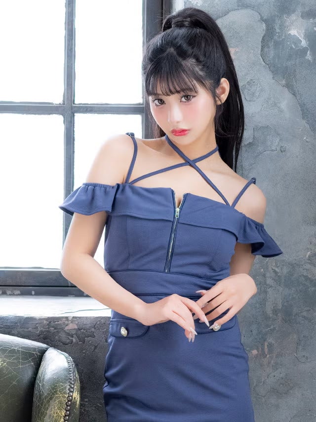 ミニ丈 キャバクラ クラブ ラウンジ ミニドレス 肩あき クロスネック ジップ パイピング フェイクポケット ストレッチ XL タイト ブルー キャバドレス