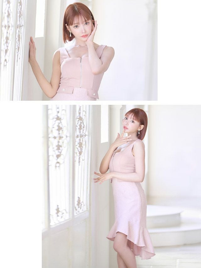 キャバドレス ミニ丈 キャバクラ クラブ ラウンジ ノースリーブ バストジップ ポケット切り替え ツイードミックス マーメイド 膝丈 テールドレス